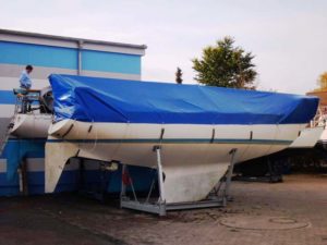 Am 20. Oktober war Aufslippen. Das Wetter war warm und sonnig, so dass viele Segler meinte, man hätte doch lieber segeln sollen, an statt die Boote an Land zu stellen. Ich fand es ganz angenehm, das die Aktion nicht bei Eiseskälte und im Regen ablief. So konnten wir auch noch schnell die Winterlagerplane trocken aufbauen und nun stehen ENTE und SNAEDIS, wie schon in den vergangenen Jahren, kuschelig nebeneinander und können sich von den Erlebnissen der vergangenen Saison erzählen.