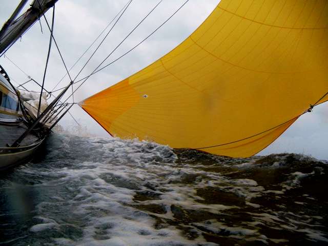 Am vergangenen Wochenende war ich wieder mit Mara und zwei Freunden von ihr (Louisa und Lasse) unterwegs. Der Sommer neigt sich anscheinend langsam dem Ende, für den Samstag waren SW 4-5, später NW drehend angesagt, mit Schauerböen bis 6 Bft., für den Sonntag W 5, in Schauerböen 6-7 Bft. Und, der Gennaker von „Faber+Münker“ war fertig, wie schön! Am Samstag ging es gleich in Regenschauern los. Da der Wind mittags auf NW drehen sollte hatten wir überlegt nach Eckernförde zu segeln. Aber erstmal wollte ich natürlich das neue, goldfarbene Vorsegel ausprobieren. Vor dem Wind aus der Strander Bucht heraus, und dann „hoch am Wind“ nach Norden in Richtung Damp. Trotz ordentlicher Schräglage fährt SNAEDIS wie auf Schienen 7.5 Knoten. Macht Spaß 🙂
