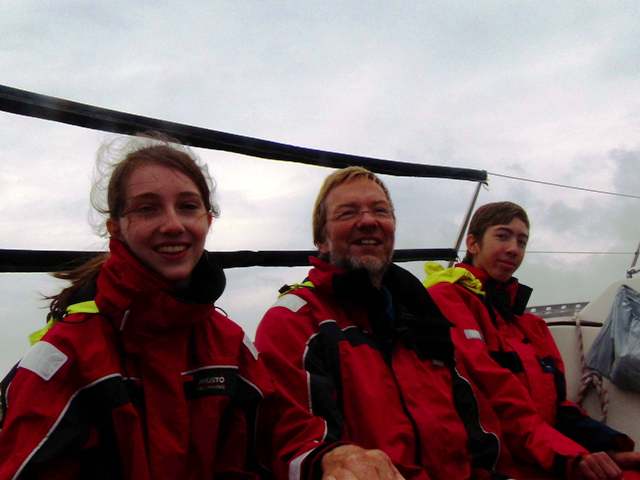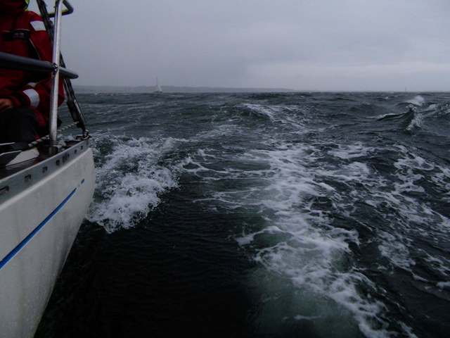 Am Sonntag scheint zum Frühstück noch die Sonne, aber ab und zu pfeifen ganz schöne Böen durch den Hafen. Den neuen Gennaker lassen wir da mal lieber im Sack. Mit ausgebaumter Genua 3 kommen wir fast genau aus der Förde hinaus. Hinter uns braut es sich dunkelgrau zusammen und wir stecken noch schnell das erste Reff ins Großsegel und ziehen alle Ölzeug an. 6-7 Bft. sind in den Böen wohl drin, wie angesagt. Bald hört es wieder auf zu regnen und schnell sind wir an Bülk vorbei wieder zurück in Strande. Wir klaren auf und gehen zum Abschluss des Wochenendes (wie immer) bei Luzifer in Schilksee essen. Hat wieder viel Spaß gemacht mit Mara und ihren Freunden, trotz der vielfältigen Gelegenheiten die Segel zu waschen.
