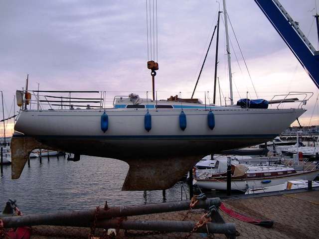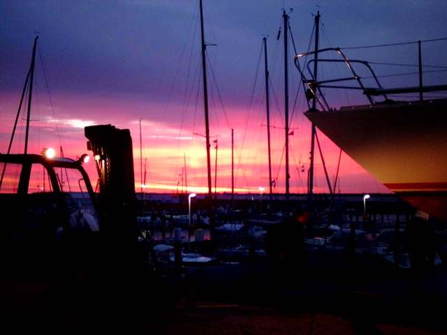 Freitagabend nach Strande, der letzte Abend an Bord. Morgen um 7:30 Uhr beginnt das gemeinsame Aufslippen beim KYC. Ich mache es mir noch einmal gemütlich und esse beim Kerzenschein zu Abend. Ein Bier ist noch an Bord, wie schön. Am nächsten Morgen ein knallroter Sonnenaufgang. Wir sind schon als fünftes Boot dran, danach kommt die ENTE. Wie immer stehen wir nebeneinander vor der Halle. Da direkt neben uns die nach uns kommenden Boote mit dem Hochdruckreiniger unter Wasser gesäubert werden „schauert“ es bei uns regelmäßig, obwohl es sonst trocken zu sein scheint. Aber zwischendurch kann ich schon mal die Reling abbauen, den Firstbalken hinlegen, und doch schon die Plane aufbauen. Um 15 Uhr steht SNAEDIS wieder kuschelig verpackt neben der ENTE.