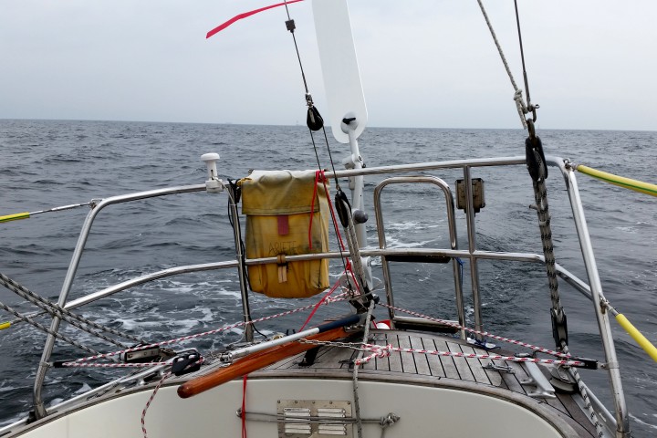 Gestern am Himmelfahrtstag bin ich einmal Rund um das Sperrgebiet vor der Schlei gesegelt. Am Wind außen am Sperrgebiet hoch zur Schlei, zwei Kreuzschläge unter Land, dann zurück Richtung Kiel. Nach dem Sperrgebiet den Gennaker hoch, ein spitzer Kurs zurück in die Kieler Förde, auf dem man aufmerksam nach dem Wind steuern muss. Bin begeistert, wie die „Pacific“ das gemacht hat. Beim Bergen des Gennakers stelle ich fest, dass sich oben im Mast am Bergeschlauch etwas verklemmt hat. Also das Segel ganz konventionell hinter dem Großsegel bergen. Leider gehen mir größere Teile des Segels dabei Baden – 85 m² nasses Tuch unter Deck, suuuper.